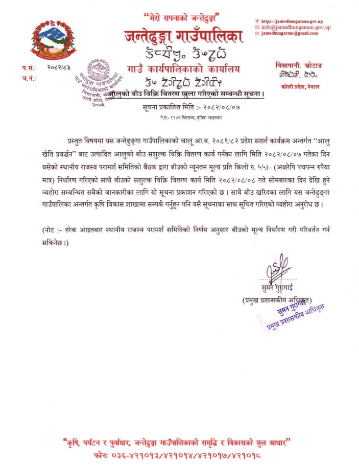 » आलुको बीउ बिक्रि वितरण खूल्ला गरिएको सम्बन्धी सूचना ।
