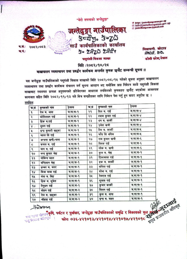 » बाख्रापालन, सुंगुरपालन,कुखुरापान व्यवस्थापन तथा प्रवर्द्धन कार्यक्रम अन्तर्गत कृषक छनौट सम्बन्धी सूचना ।