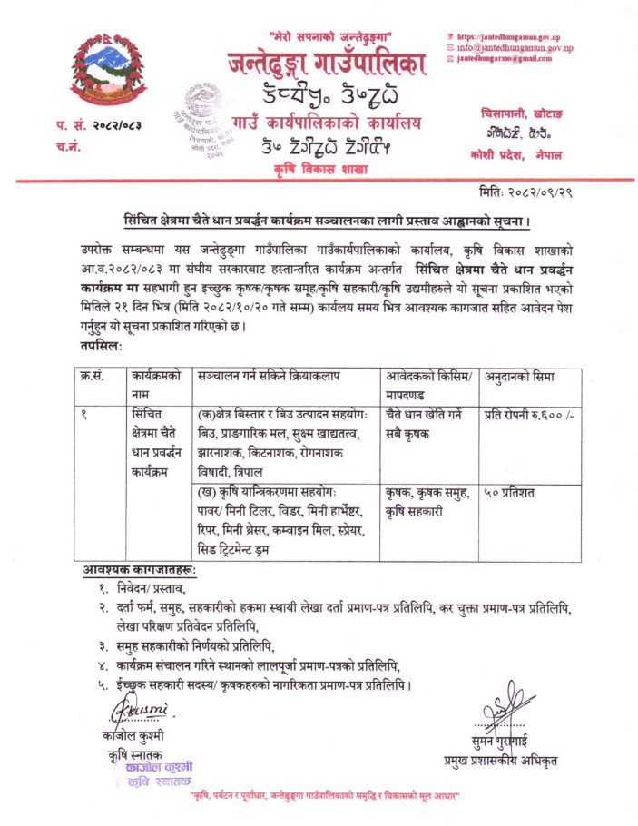 सिंचित क्षेत्रमा चैते धान प्रवर्द्धन कार्यक्रम सञ्चालनका लागी प्रस्ताब आह्वानको सूचना ।