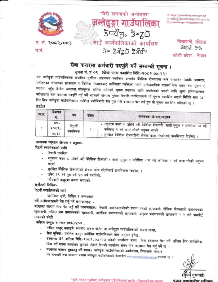 सेवा करारमा कर्मचारी पदपूर्ति गर्ने सम्बन्धी सूचना ।