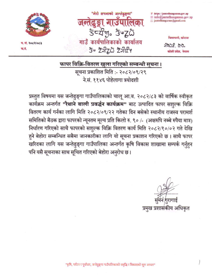 "कृषि, पर्यटन र पुर्वाधार, जन्तेढुङ्गा गाउँपालिकाको समृद्धि र विकासको मुल आधार"