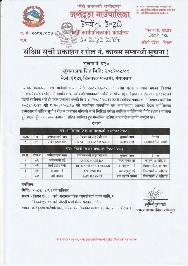 संक्षिप्त सूची प्रकाशन र रोल नं. कायम सम्बन्धी सूचना ।